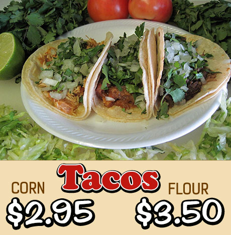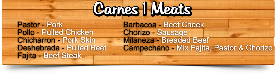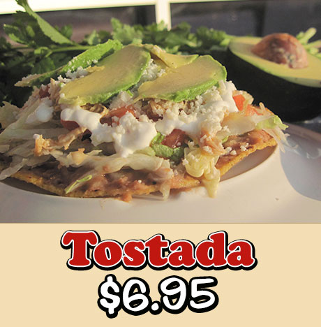 Beans, Choice of Meat, Sour Cream, Queso Fresco, Avocado, Lettuce, Tomatoes.